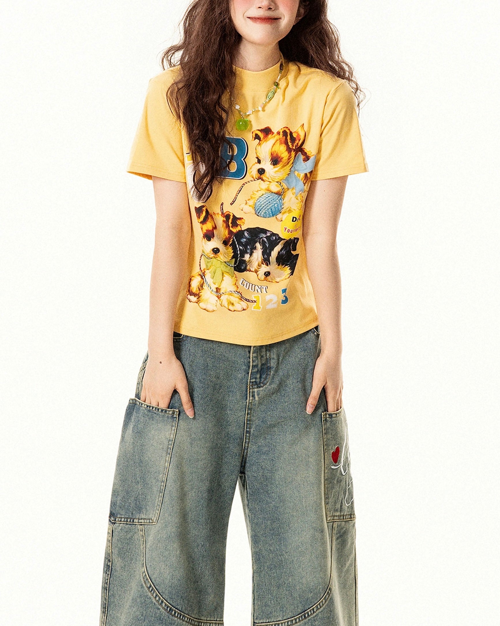 遊び心のあるキュートな子犬柄をモチーフに、柔らかく着心地の良いコットン素材を使用。夏の装いにリラックスした子供らしい雰囲気をプラス。シンプルなラウンドネックとゆったりとしたシルエットは、普段着にも、友達とのお出かけ時にリラックスした個性をアピールするのにぴったりです。