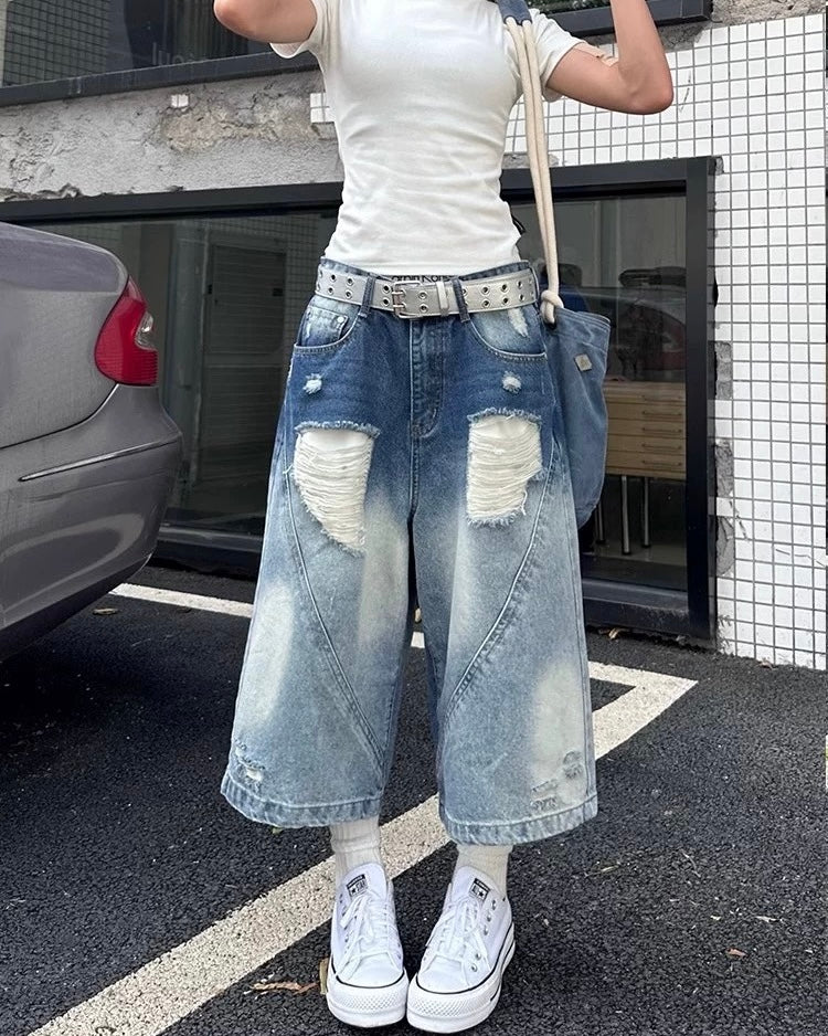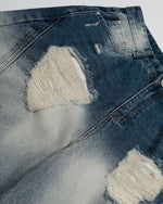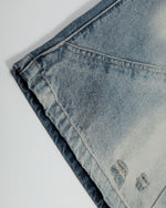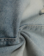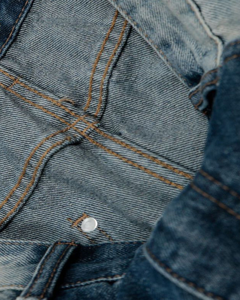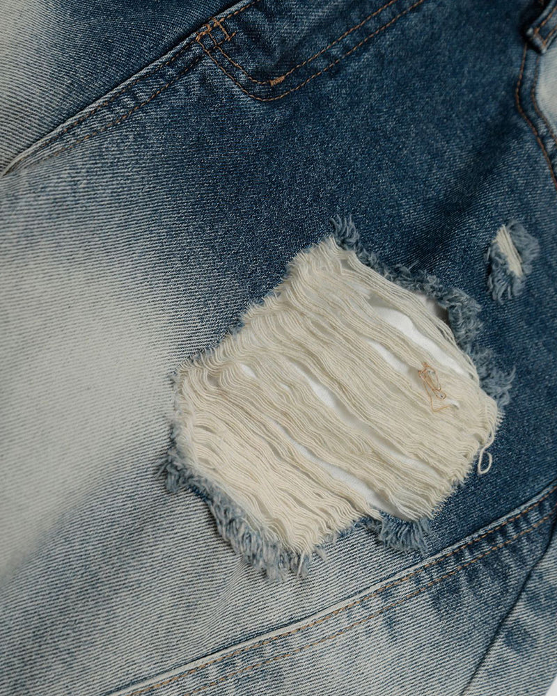 上質なデニム生地を使用し、クラシックなウォッシュ加工と自然なグラデーショントーンが織りなすレイヤード効果を演出。リップドデザインがストリート感をプラスし、絶妙なディテールがカジュアルな魅力を際立たせています。